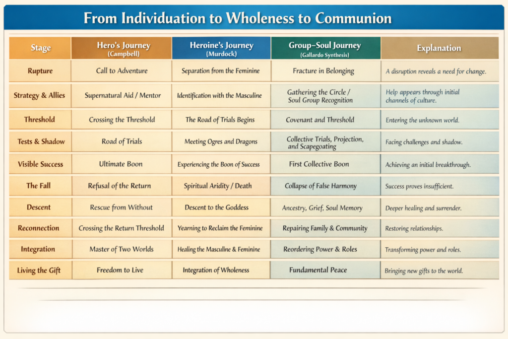 Die Reise des Helden Zentren der Transformation des individuellen Selbst. Die Reise der Heldin strebt nach Ganzheit, indem die Spaltung zwischen dem Weiblichen und dem Männlichen geheilt wird. Die Gruppen-Seelenreise Erweitert beide Handlungsstränge in Richtung kollektiver Evolution, wobei Heilung Seelengruppen, Familiensysteme, erweiterte Verwandtschaft, Gemeinschaft, Land und die Neugestaltung der Macht selbst umfasst, so dass Frieden relational, strukturell und gelebt wird.